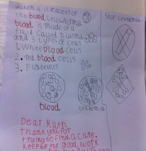 This poster is on the wall by my desk. It was drawn by my young friend Nicholas. Nicholas is really keen on all things science and came with his mum to have a look at a science lab. He had done his research on leukaemia and brought me this cool picture. Thank-you Nicholas.