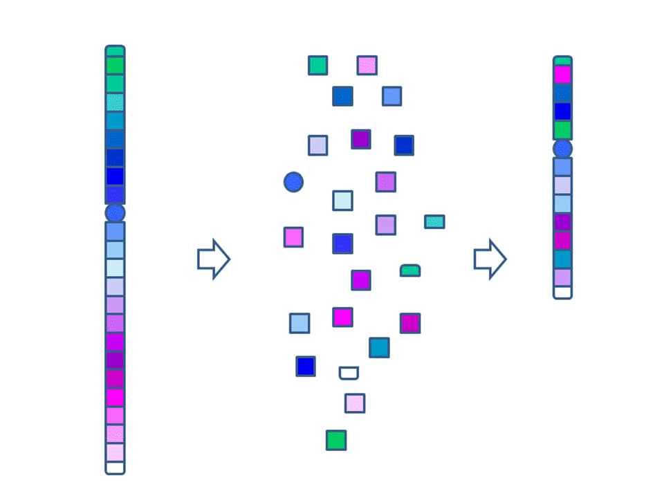 This shows how the chromosome shatters and rejoins in a random order. Note that the two ends of the chromosome and the centromere (represented by a circle) are preserved. These are essential features of a functioning linear chromosome. From MacKinnon and Campbell 2013. Cancer Genetics 206:238-251.
